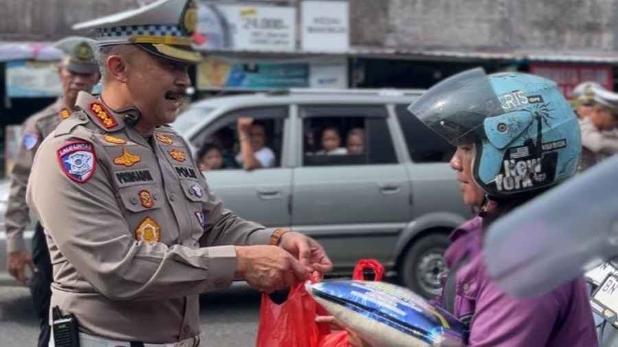 Dit Lantas Polda Babel Bagikan Puluhan Paket Sembako Ke Pengendara, Ingatkan Pentingnya Keselamatan Berkendara
