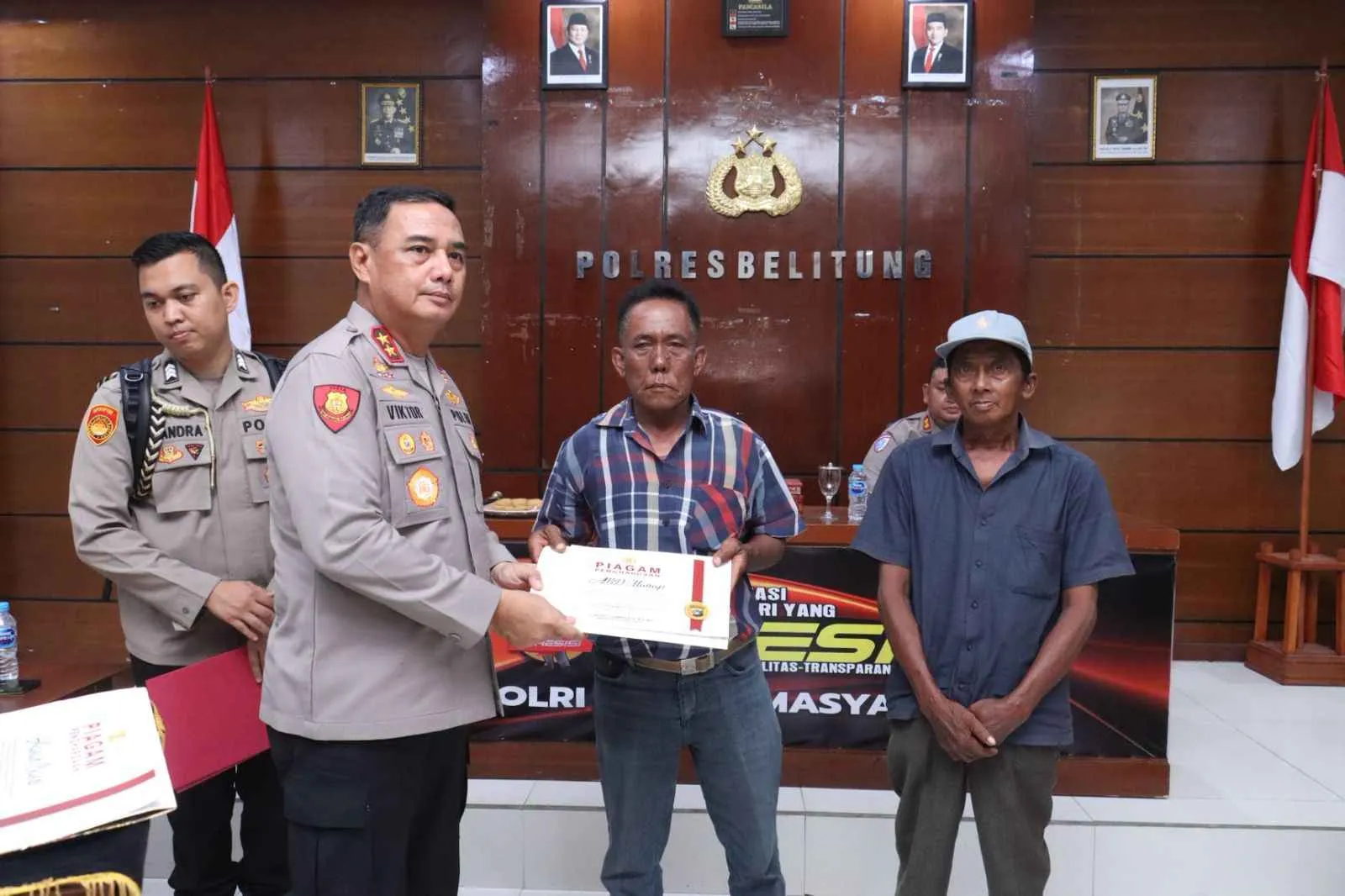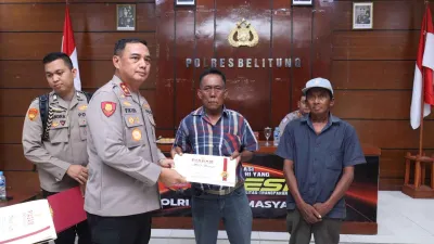 Penghargaan tersebut diberikan dalam kegiatan tatap muka yang berlangsung di Aula Tribrata Polres Belitung, Jumat (27/3/2026). Dua nelayan penerima penghargaan tersebut yakni Hasan Basri dan Abdul Manap, yang telah menunjukkan kepedulian serta keberanian dengan melaporkan temuan narkotika kepada pihak kepolisian.