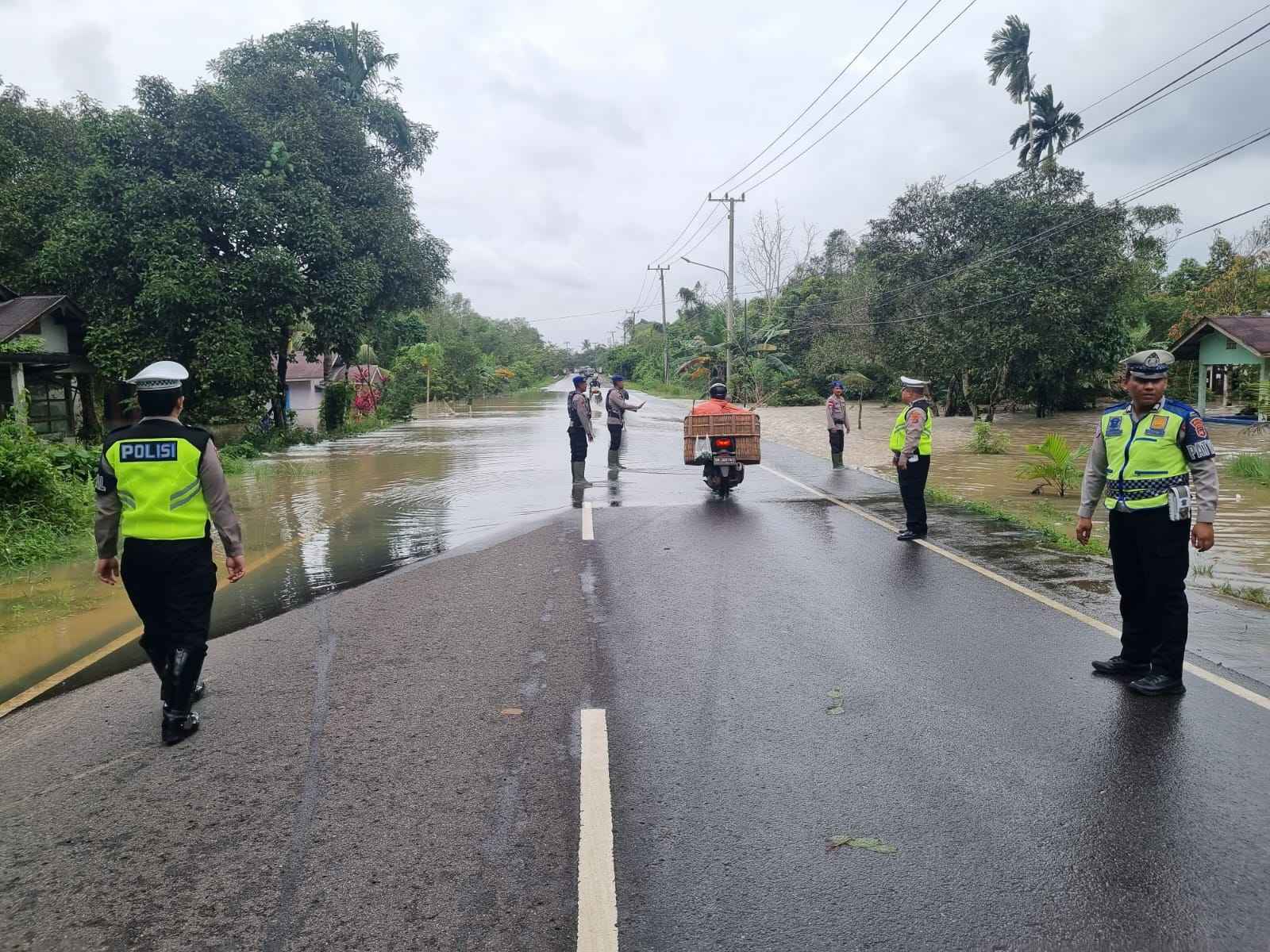 Kegiatan patroli tersebut dipimpin oleh Aipda Hadi Kurniawan, yang bersama personel di lokasi melakukan pengaturan lalu lintas serta memberikan imbauan kepada para pengguna jalan agar selalu meningkatkan kewaspadaan, mengurangi kecepatan, dan mengutamakan keselamatan saat melintas di kawasan yang terdampak genangan air.