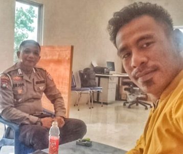 Kanit Laka Lantas Polres Lingga, Sopi Maulana saat menerima Reporter Hitvberita.com Ruslan LGA di kantornya. Sopi menegaskan pihaknya tengah menyiapkan langkah hukum terhadap pelaku yang diketahui bernama Amat tersebut. (Foto/Rus/HITV)